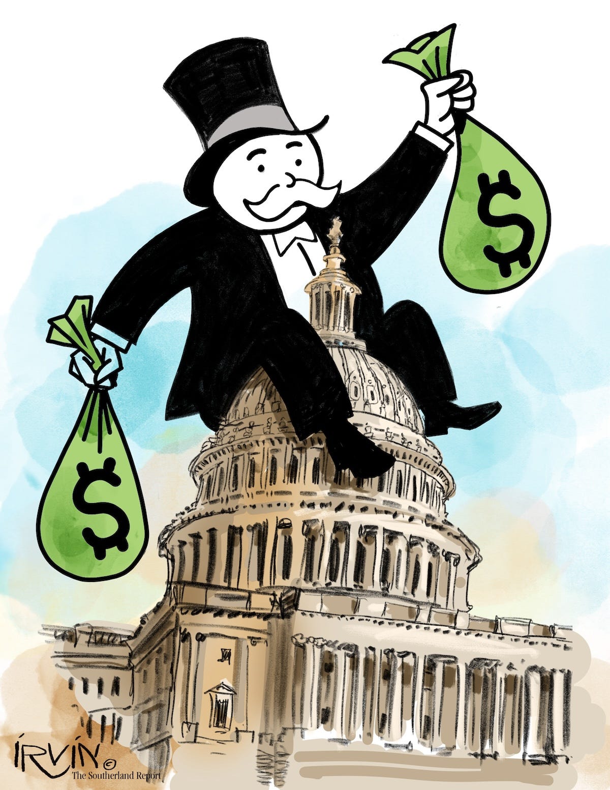 *Special thanks to Trevor Irvin for today’s illustration that captures what is happening in Washington these days with big money. Trevor and I have been friends since the late 1970s when we both worked at the Atlanta Constitution. He’s still drawing illustrations for clients and also publishes a Substack featuring his creative cartoons (stuff you won’t see in any newspaper) that accompany his musings on the insane world in which we now find ourselves. Most of his posts are funny and profane, but today’s post — “I am an American” — has a more profound tone about the values shared by those who call ourselves American, values not shared by those currently in charge of things. I encourage you to subscribe.